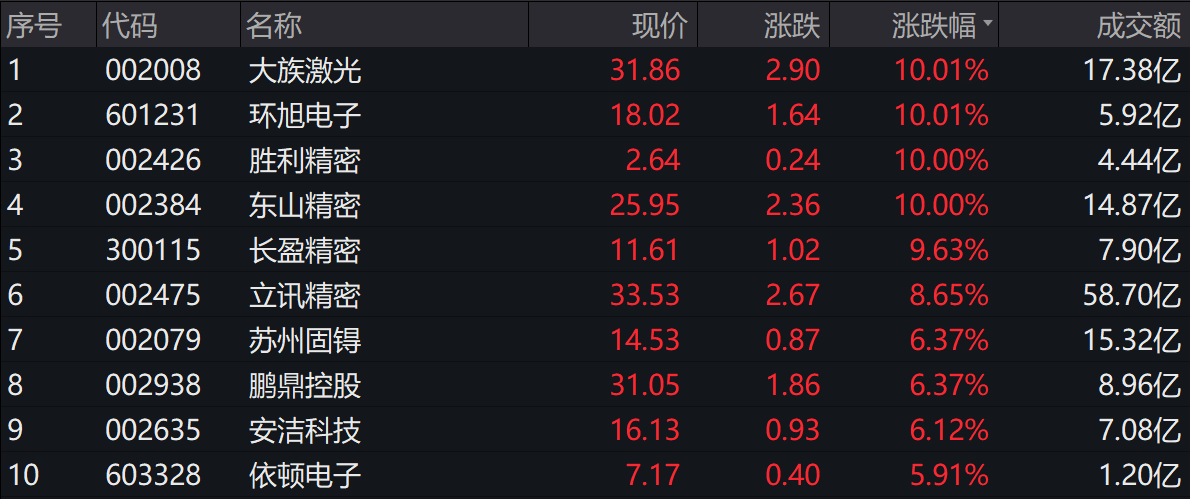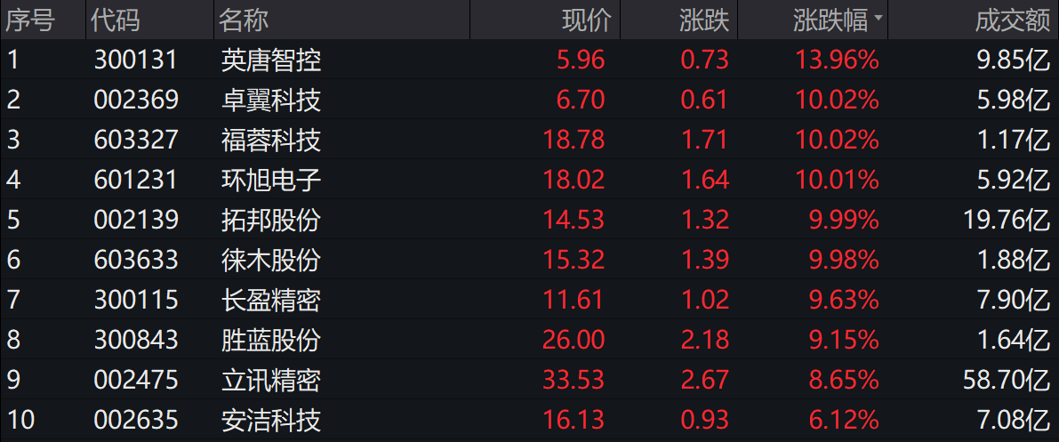 个股方面,Wind数据显示,英唐智控(300131)、卓翼科技(002369)、福蓉科技(603327)、环旭电子(601231)涨停或涨超10%,长盈精密(300115)、立讯精密(002475)等涨幅也居前列。