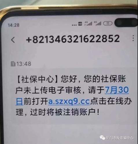 30日13时许,林先生接到冒充社保局的短信,大致内容是:“【社保中心】,您好 ,你的社保账户未上传电子审核,请于7月30日前打开a.szxq9.cc点击在线办理,过时将被注销账户!”