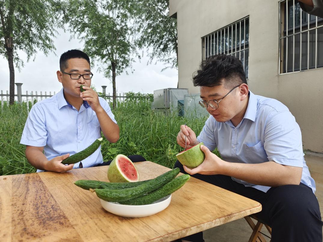 菜蔬滴翠盎生机,瓜果斑斓灿碧琦。下班后员工们手里拿着沁凉的西瓜和刚摘下清脆可口的黄瓜,傍晚时分坐在瓜田下乘凉聊天。夏季正是瓜果成熟的季节,自己菜园的无公害的黄瓜,不用洗,咔嚓咔嚓咬着吃,入口带着清凉,脆生生的,有着与众不同的清爽口感。冰凉沙瓤的西瓜,一口咬下去满嘴汁水,带着丝丝甜意流进心间。坐在绿油油的菜园中,看着来往忙碌的车辆,天空布满淡紫色的晚霞,谁又能说这样的生活不够惬意呢?