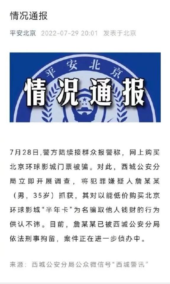 7月29日晚,北京警方通报购买环球影城门票被骗事件。通报称,7月28日,警方陆续接群众报警称,网上购买北京环球影城门票被骗。对此,西城公安分局立即开展调查,将犯罪嫌疑人詹某某(男,35岁)抓获,其对以能低价购买北京环球影城“半年卡”为名骗取他人钱财的行为供认不讳。目前,詹某某已被西城公安分局依法刑事拘留,案件正在进一步侦办中。