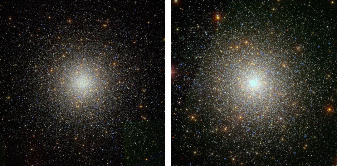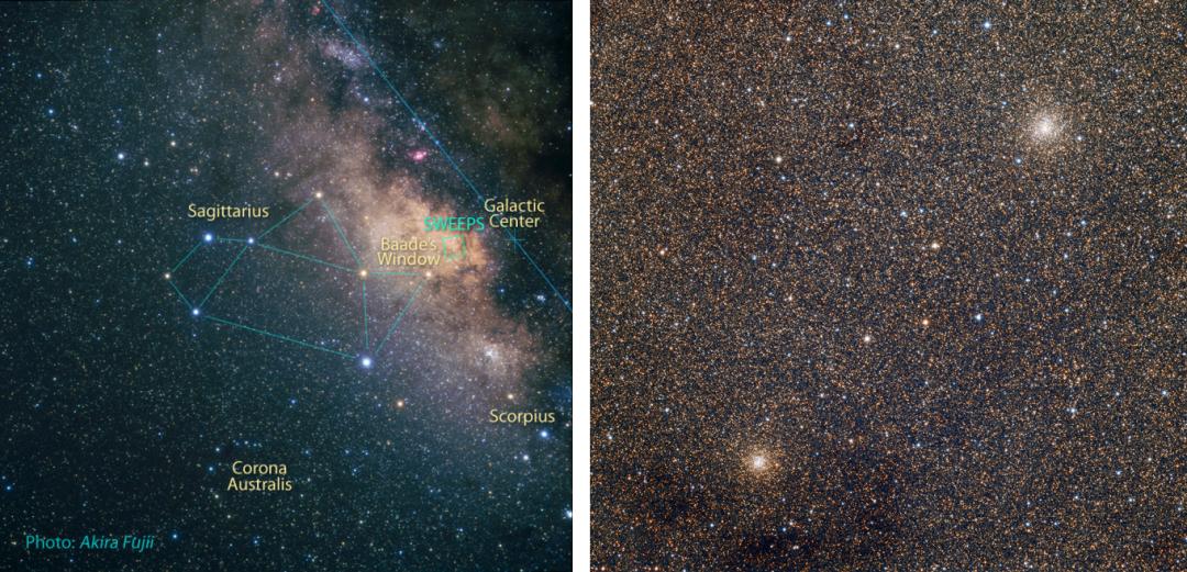 图:巴德窗在银河的位置(左,浅黄色的“Baade's Window”所在的区域)以及32英寸(81厘米)的Schulman望远镜上的相机拍摄的巴德窗内的两个球状星团(NGC 6522,图中右上;GC 6528,图中左下)与周围的众多恒星(右)。图源:参考文献[33](左);参考文献[34](右)