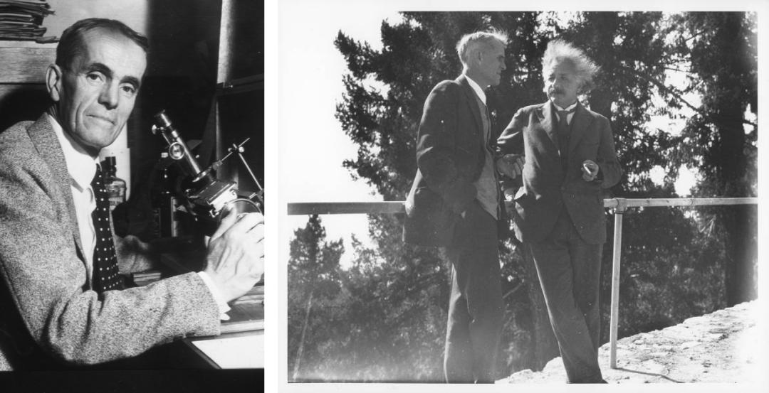 图:亚当斯(左)以及亚当斯与来访的爱因斯坦在威尔逊天文台的合影(右)。图源:参考文献[19](左);参考文献[20](右)