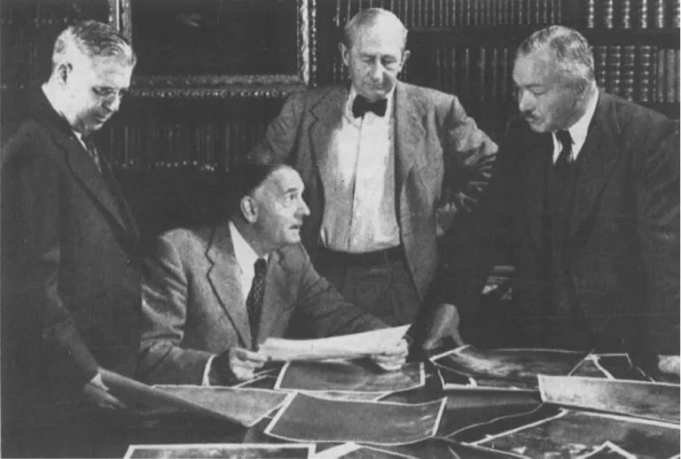 图:1950年,赫马逊、哈勃、巴德与闵可夫斯基(Rudolph Minkowski,1895-1976)(从左到右)在检查望远镜的照相底版。图源:参考文献[37]