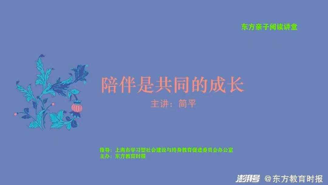 在近日举行的“东方亲子阅读讲堂”第三讲的直播讲堂上,作家简平以“陪伴是共同的成长”为题,讲述了关于亲子阅读的几个误区,亲子阅读的形式,亲子阅读对父母自身成长的作用,受到了家长听众们的热烈欢迎。