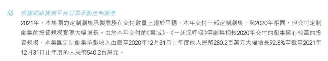 稻草熊影业2021年营收17.03亿元,同比增长78.8%;毛利约为5.16亿元,同比上升98.7%,调整后净利润1.94亿元,同比增长48.3%。这背后,稻草熊定制剧承制收入为5.4亿元,同比增长92.8%,占总收入的三分之一,成公司增长最快业务。稻草熊董事会主席兼首席执行官刘小枫也明确表示,来自爱奇艺的收入占稻草熊总体收入的50%左右。