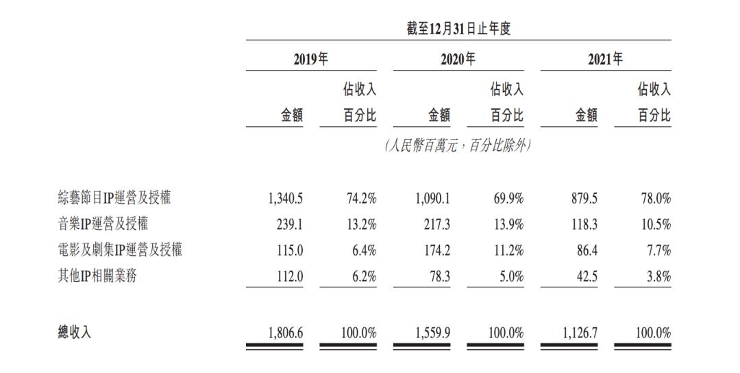 从业绩来看,星空华文经营惨淡:2019-2021年分别实现收入18.07亿元、15.6亿元和11.27亿元,逐年递减;净利润分别为3.8亿元、-2780万元、-3.52亿元,亏损扩大;毛利从2019年的7.05亿元下滑到2021年的2.74亿元,也是连年缩水。具体拆分业务来看,无论是综艺还是音乐、电影及剧集IP运营和授权,几乎是全面下滑。