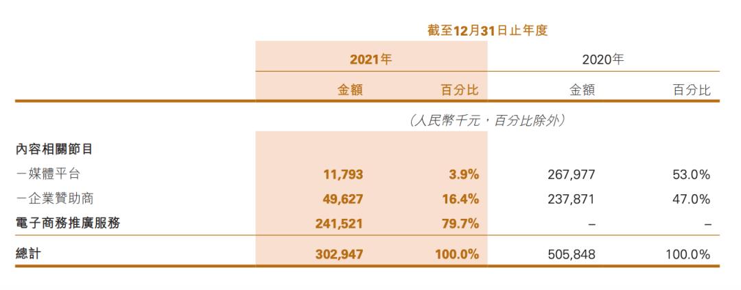 规模小意味着一旦有环境影响或者其他行业变动,公司业绩就被受到强冲击。从财报来看,去年煜盛文化来自于媒体平台的收入减少95.6%,公司表示是因为与电视台等传统平台的内容合作减少;来自企业赞助商也就是广告收入也减少了79.1%,也是因为传统冠名模式的减少,公司主要转向针对于品牌进行定制化内容制作。