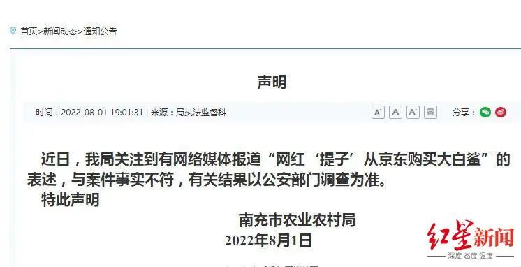 8月1日下午,南充市农业农村局发布声明称,近日我局关注到有网络媒体报道“网红‘提子’从京东购买大白鲨”的表述,与案件事实不符,有关结果以公安部门调查为准。