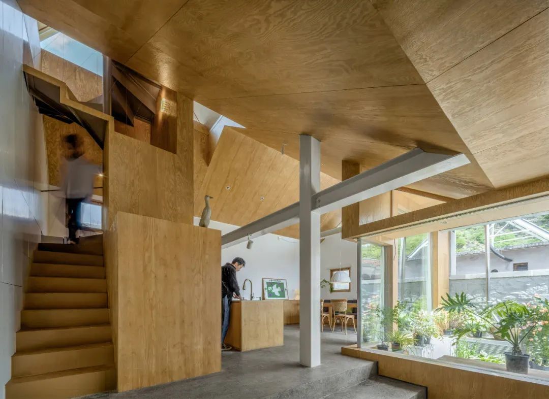 对应地面上的高差,上面的天花向下延伸成了一个更大的坡屋面,指引着人们继续往上走,直到厨房的尽头,去露台的大旋转楼梯向上延伸。