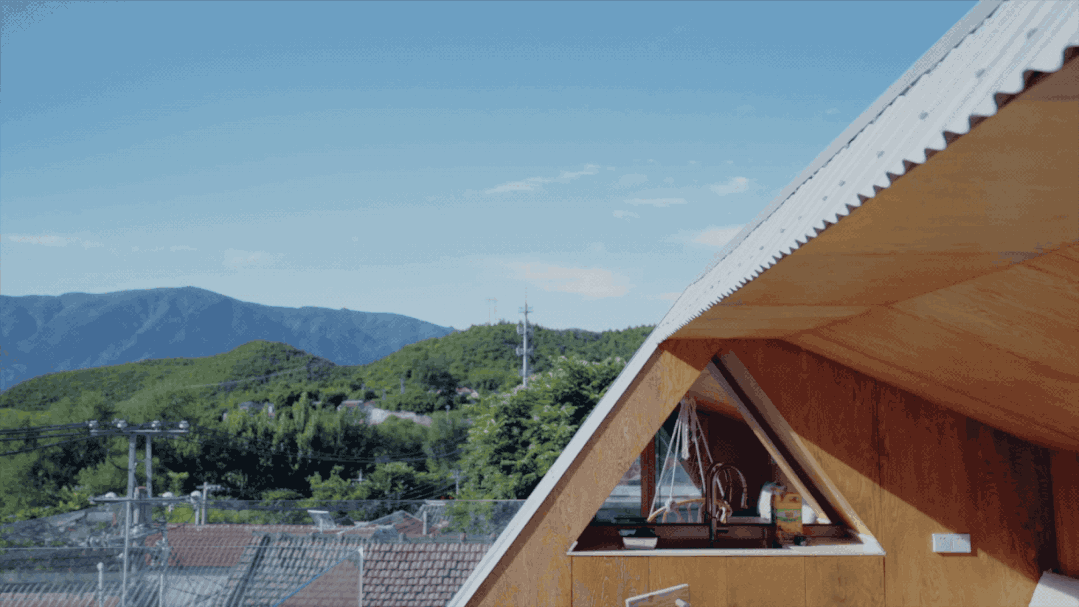 这样,外观上看好像是一个房子摞在另一个上面,两个坡屋顶互相搭接在一起,在高处形成一个三角形的空间。“还在施工的时候就有不少村民跑来围观,特别好奇:’你们家房子怎么造的,怎么长成这个样子?’原来以为他们会接受不了,但没想到建好后大家都特别喜欢,成了村中一景,”美超说。