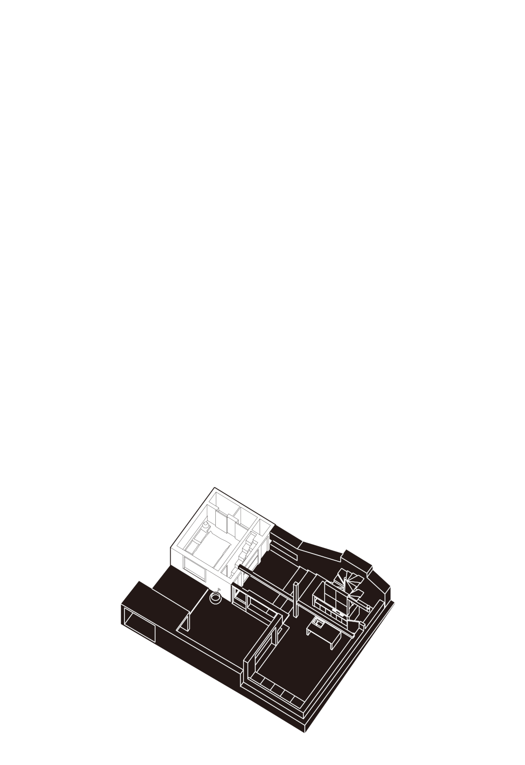 考虑到聚会来的人会比较多,夫妻俩希望能有三个带独立卫浴的卧室,等于要把160m⊃2;的功能区塞进80m⊃2;的占地。逼近极限的尺度感是这个房子的另一个特征,体验十分有趣。