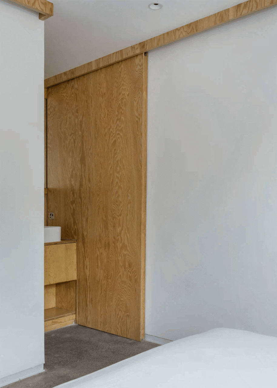 楼梯口的一小块空间被利用起来做成洗漱区,台面连成一个整体,门定制成L型,正好咬合台面:打开时宽敞、体面,关上后私密性也可以得到满足。