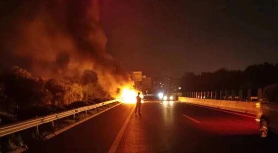 7月17日深夜,在通州区白庙检查站大约一公里处的进京道路上,一辆正在行驶的私家车突然冒起一道火光,随即燃起了熊熊火焰,瞬时冒起的团团白烟遮蔽了夜空。