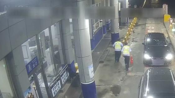 站内值守的民警们在视频监控中发现了这一突发情况,同时注意到现场有部分群众滞留,且后方持续有车流驶过,形势非常危急。为控制火势,保护现场群众和其他通行车辆安全,值班领导迅速指派值班民警李金禄、姚航云带领辅警队员携带灭火器赶赴现场。