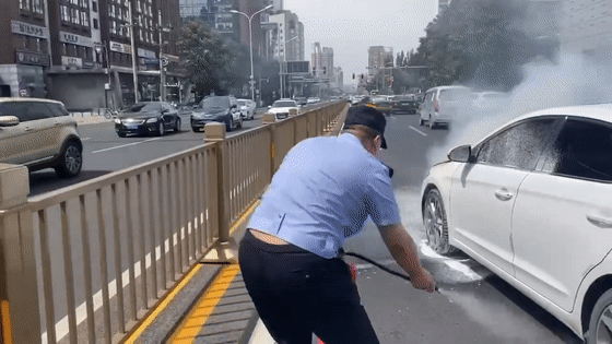 今年6月的一个周末,朝阳分局八里庄派出所民警张杰在辖区巡逻时,发现一辆白色轿车停在路上,前引擎盖处冒出阵阵浓烟,疑似发生了自燃。当时过往的车辆、行人非常多!加之车上很快蹿出了火苗,张杰立即将警车停好,以最快的速度疏散周边群众,接着又马不停蹄拿出巡逻车内的灭火器。