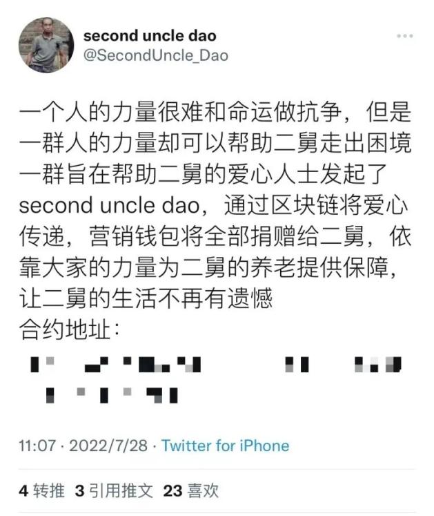 但从一开始,「second uncle dao」就未公开任何与二舅或者「衣戈猜想」建立过联系的凭证,也许是项目方不能露面的考虑,或者这是一场低调到想给二舅一个惊喜的募捐活动,但最后募到的钱如何给到二舅手里,这成了一个疑问。