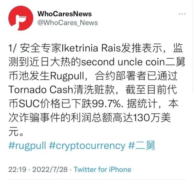 图源:推特晚上22点,空投的24小时期限将过一半,另一个推特账号「WhoCaresNews」突然表示,二舅币的合约部署者被检测到已通过加密货币交易平台Tornado Cash,把炒高了的二舅币中自留的那部分脱了手。