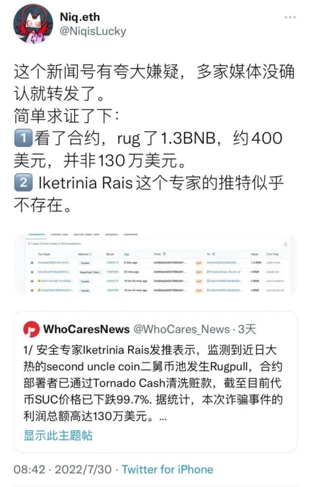 这是区块链优越的地方,交易记录摆在光明处,不用去公司总部的保险柜里去翻账本。从二舅币的合约查到的交易记录显示,一共就卖了1.31个BNB(币安币),按当下的币价来看,不到4600人民币,而「WhoCaresNews」援引的那位推特上的“安全人士”,账号查无此人。