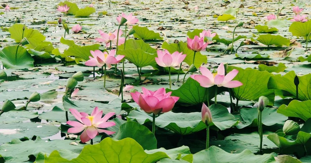湖边垂柳依依,水面朵朵莲花随波摇曳、争奇斗艳,成群的鸭子在湖中嬉戏,黑天鹅点缀其中,一派江南水乡风情……