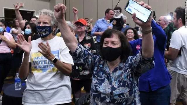 堪萨斯争取宪法自由运动的负责人雷切尔·斯威特(Rachel Sweet)对人群说,投票“对堪萨斯州和美国来说都是真正具有历史意义的一天”,人们为此欢呼雀跃。