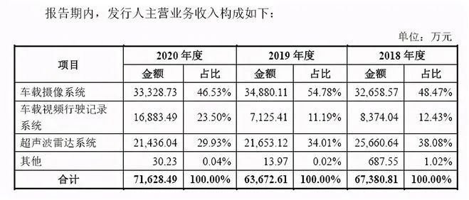 与同行业增长形成对比的是,在2020年,豪恩汽电收入占比较大的两大产品——车载摄像头系统、超声波雷达系统收入均出现了下滑。在2018年-2020年的过去三年,车载摄像系统营业收入分别是3.27亿元、3.49亿元、3.33亿元,占总营业收入的比例分别是48.47%、54.78%、46.53%,营业收入在2020年出现了下滑。