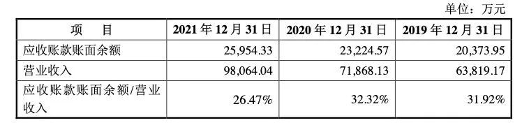 招股书显示,报告期内,豪恩汽电应收账款账面余额分别为2.04亿元、2.32亿元、2.60亿元,整体呈增长趋势。2019年末、2020年末和2021年末,公司应收账款账面余额占营业收入的比例分别为31.92%、32.32%和26.47%,占比较为稳定。