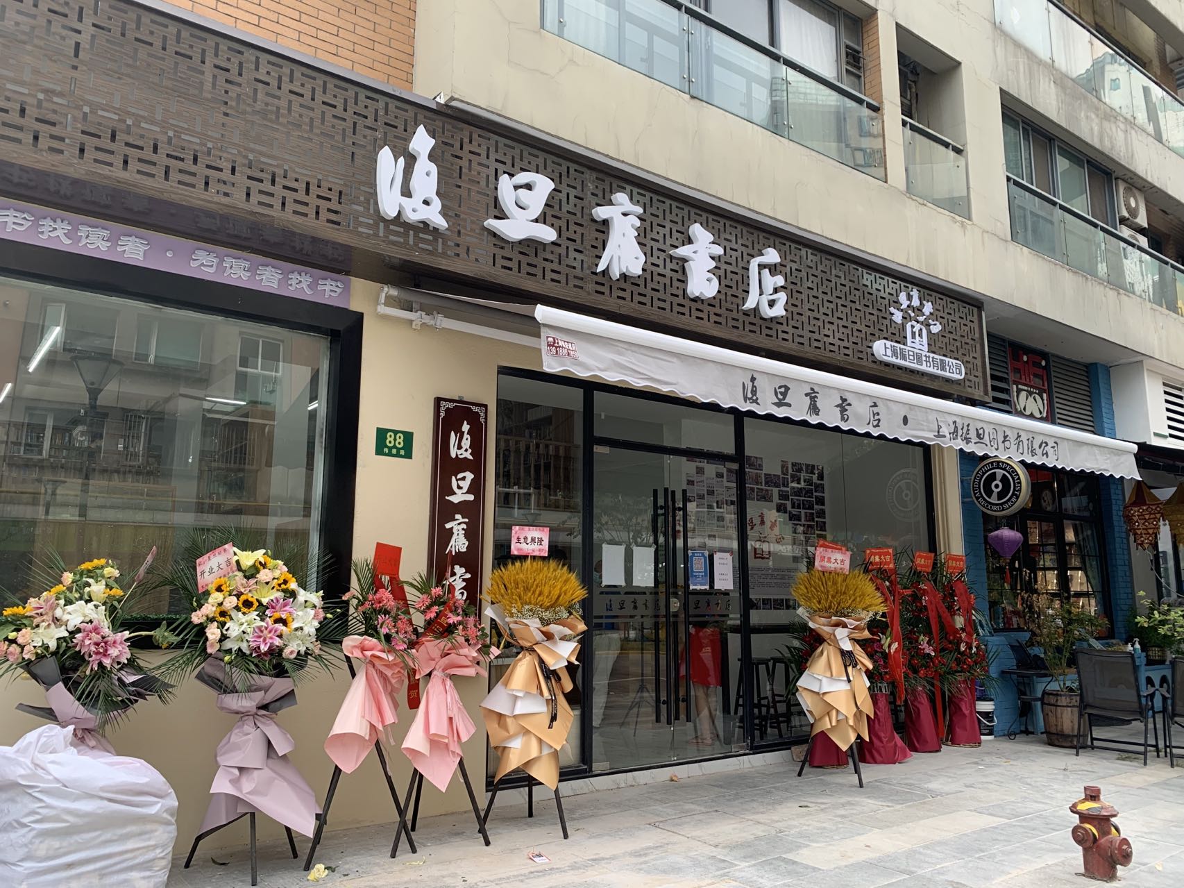 位于伟德路88号的复旦旧书店新店,门口摆满花篮