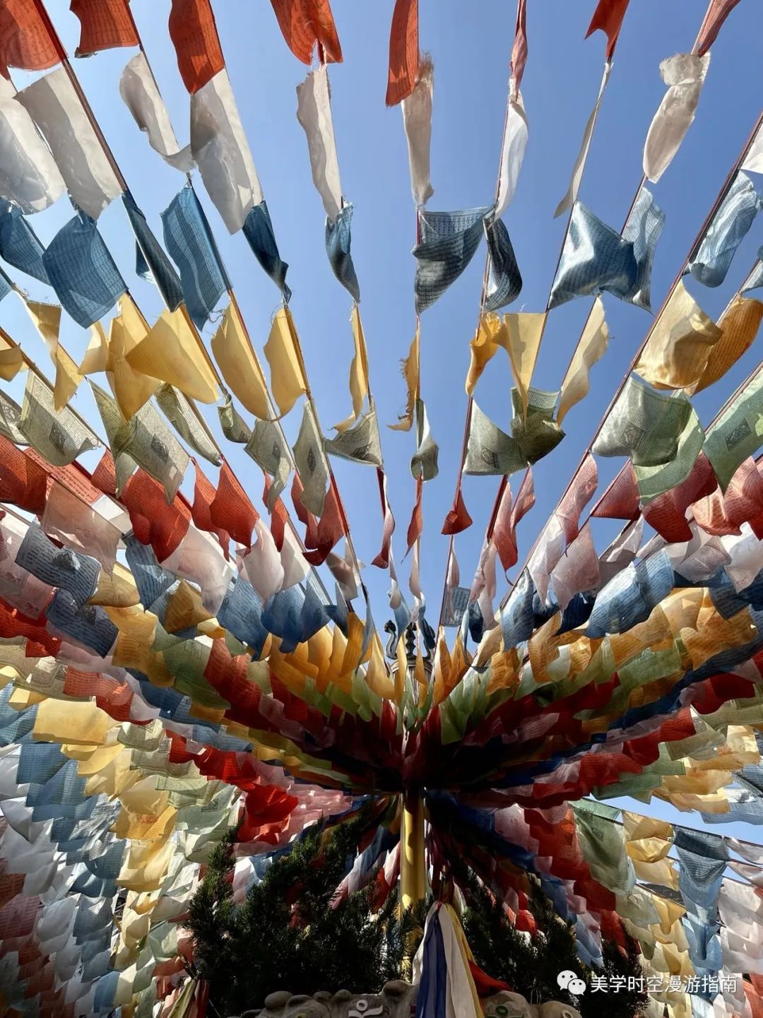 藏经阁里有巨幅唐卡,精美可观。但最惊艳的还是寺庙最后面祈福墙角的五彩经幡。