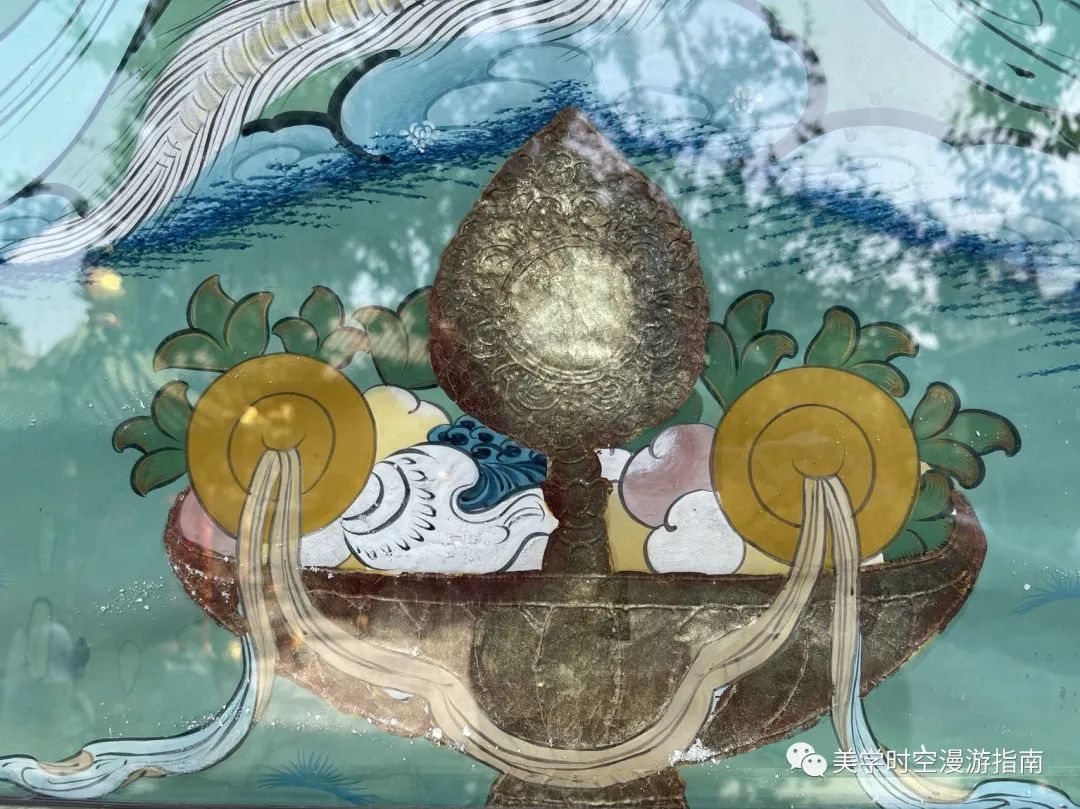 巨幅唐卡很难拍全,干脆贴上去拍张局部。这里装水果的金盆还是旧的色泽,但里面的水果全是新补的,新旧分明之外又有微妙的和谐,不同的时光被涂抹在同一方世界中。