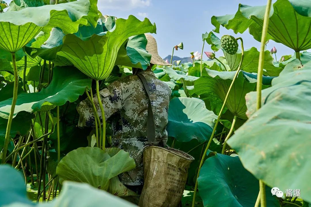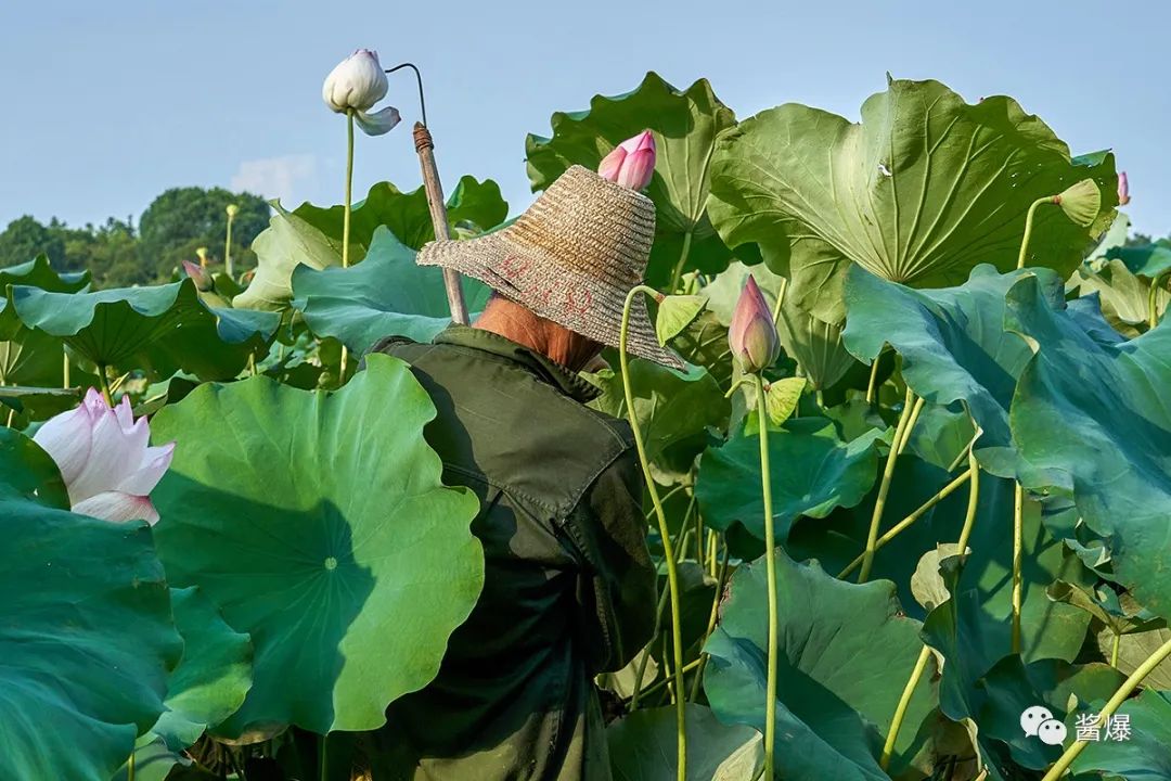 每个采莲人手里都有一根铁钩,看见可以采摘的荷花和莲蓬就一把勾带身前,折断收到背包里。