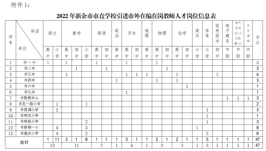1.引进单位、岗位、学历、人数、专业等方面具体条件见附件1:2022年新余市市直学校引进市外在编在岗教师人才岗位信息表。