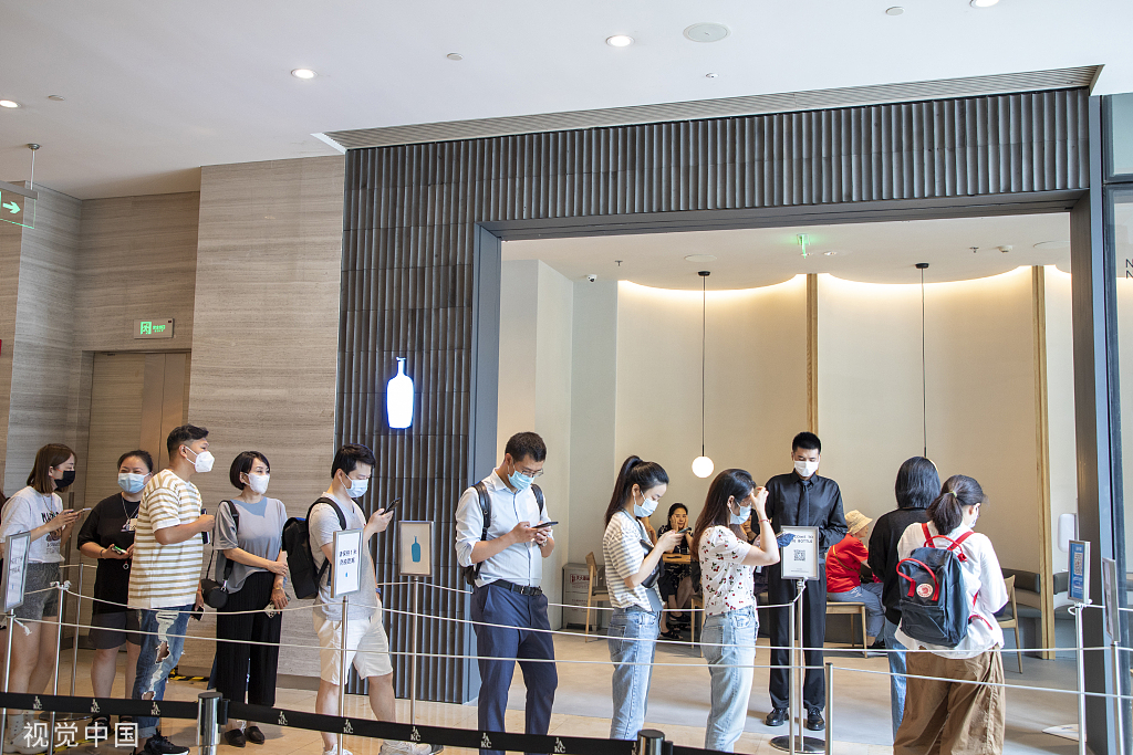 2022年8月9日,蓝瓶咖啡在上海的第二家店吸引市民排队潮,前来打卡的年轻人络绎不绝。视觉中国 图