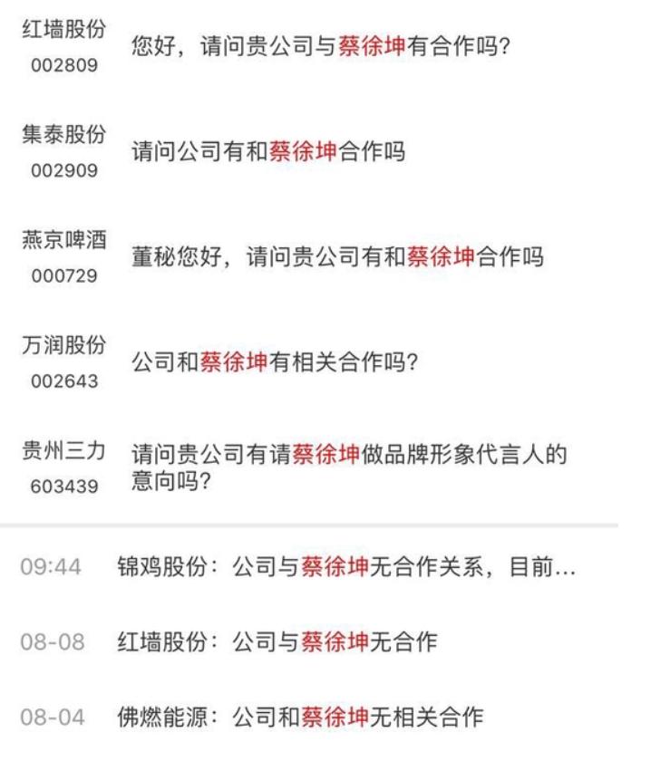 8月9日消息,作为流量明星,蔡徐坤近期频繁受到一些投资者关注。近日,不断有投资者在互动平台向上市公司询问是否与蔡徐坤有合作关系。大族激光、佛燃能源、红墙股份、万润股份、集泰股份、锦鸡股份等多A股上市公司均成为被问及的对象。对此,他们均声称与蔡徐坤没有合作关系。