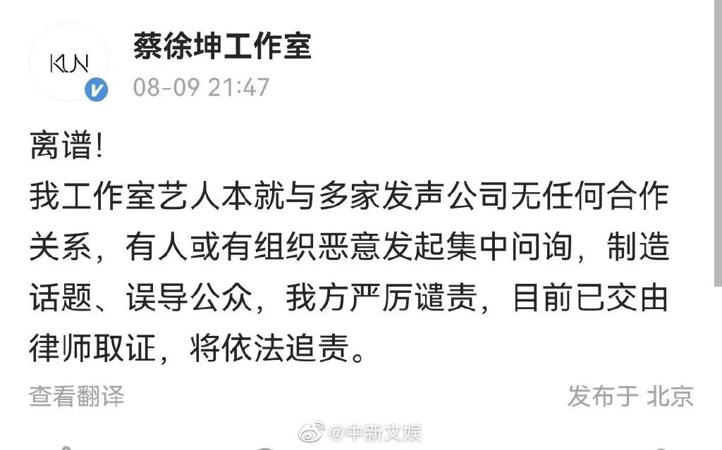 随后,@蔡徐坤 工作室发文回应:“离谱!我工作室艺人本就与多家发声公司无任何合作关系,有人或有组织恶意发起集中问询,制造话题、误导公众,我方严厉谴责,目前已交由律师取证,将依法追责。 ”