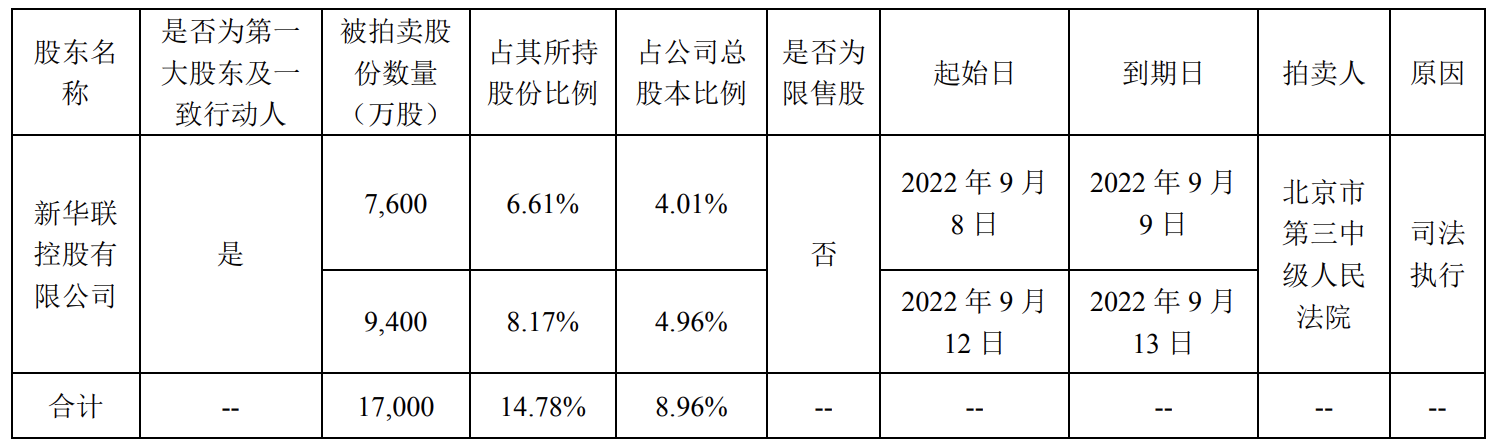新华联称,本次司法拍卖事项不会导致公司控制权发生变更,不会对公司的正常生产经营产生重大影响。另外,本次司法拍卖事宜尚处于公示阶段,后续将涉及竞拍、缴款、股权变更过户等环节,拍卖结果存在不确定性。