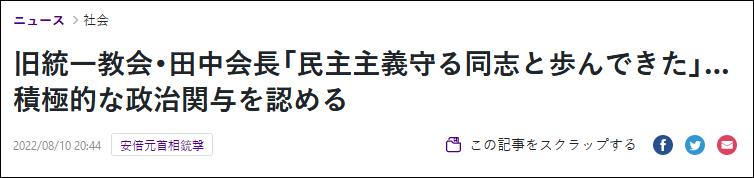 田中承认:与自民党议员有接触综合《读卖新闻》、共同社10日消息,田中富广当天在位于东京的“日本外国记者俱乐部”召开记者会。他承认教会与国会议员存在联系,曾鼓励成员“积极参与国家政治,参与选举”。