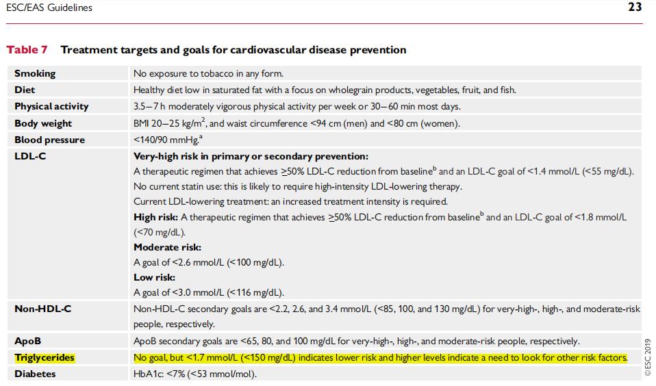 既然中国指南未给出答案,那就查阅一下国际指南吧,于是找出了2019版欧洲血脂异常管理指南。由下图(原文表7)可见,欧洲指南明确指出(我涂黄部分):甘油三酯不作为治疗靶点,但甘油三酯<1.7 mmol/L提示心血管风险较低,甘油三酯增高者需要查找其他危险因素。这个答案依然没有给我答案,如果一定说是给了我答案,那就是“不用降甘油三酯药物治疗”!