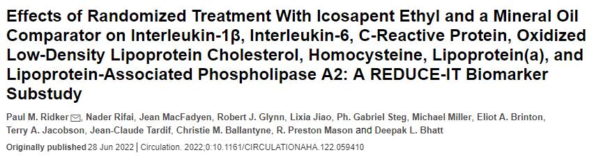 关于奄奄一息的烟酸不必多说了,再说说鱼油制剂吧。近年来,以n-3脂肪酸为主要成分的鱼油制剂也一直备受关注,特别是著名的REDUCE‐IT 研究曾给大家带来一个大大惊喜。但是首先说明一点,该研究中鱼油治疗组的获益并不是通过降低甘油三酯水平实现的,具体分析请参见本公众号以往推送的短文。因此,不能将这项研究作为应用药物干预高甘油三酯血症的依据。还有一个问题不得不说,这就是REDUCE-IT研究生物标记物亚研究,如下图: