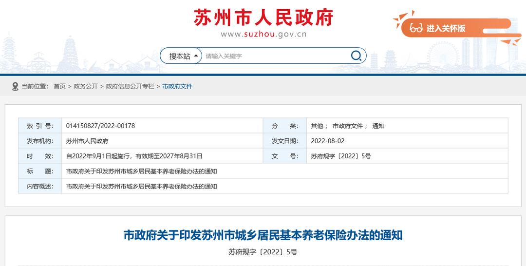 自2022年9月1日起施行,有效期至2027年8月31日。《苏州市居民社会养老保险管理办法》(苏府规字﹝2011﹞15号)《市政府办公室关于进一步完善城乡居民基本养老保险制度的意见》(苏府办﹝2015﹞55号)和《市政府关于修改