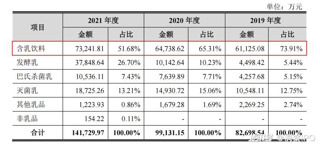 报告期内,菊乐股份含乳饮料的销售金额分别为6.11亿元、6.47亿元、7.32亿元,分别占总收入的73.91%、65.31%、51.68%。