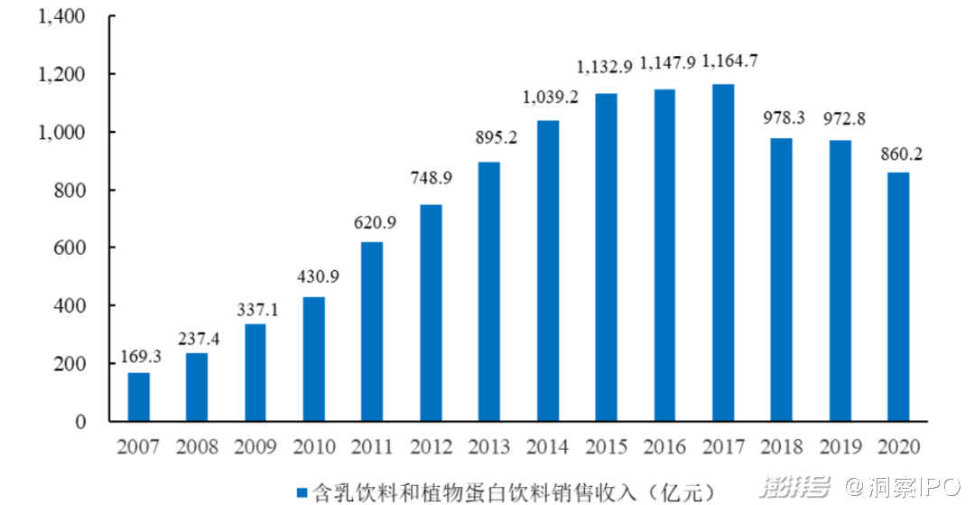 招股书显示,2007年至2017年,国内含乳饮料和植物蛋白饮料制造行业销售产值从169.25亿元增长至1164.7亿元,年复合增长率达21.27%。