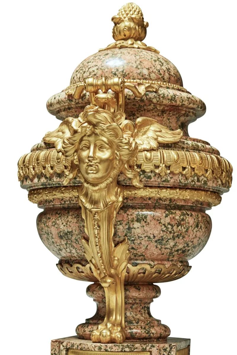 这一樽路易十四风格的花瓶上以铜鎏金打造了狮身人面的“斯芬克斯”神话形象
