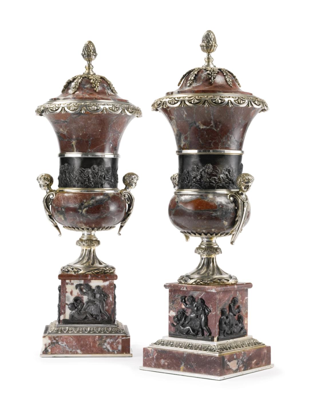 路易十四风格镀银古铜色大理石带盖花瓶,瓶身饰有小天使的形象巴洛克末期,随着著名的美学理念「霍加斯曲线」的诞生,迷恋“S形”的浪潮席卷了整个欧洲。凡尔赛宫内,流线型的插花也初现端倪。