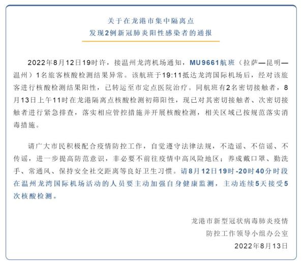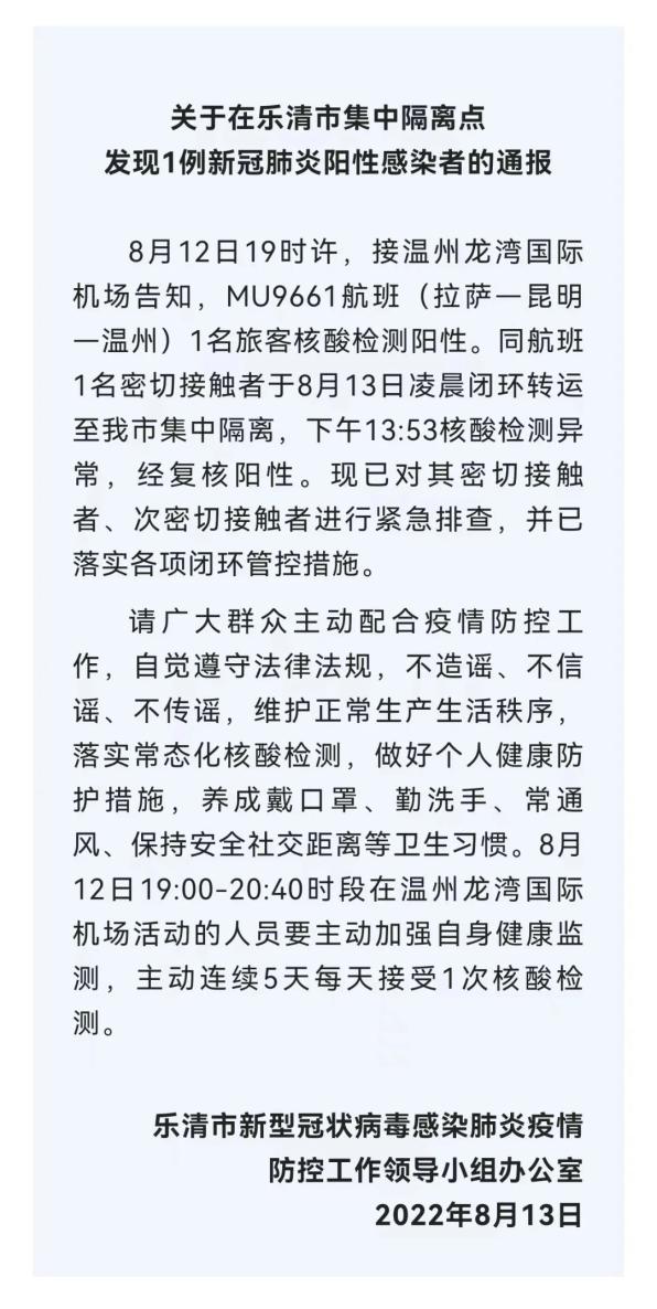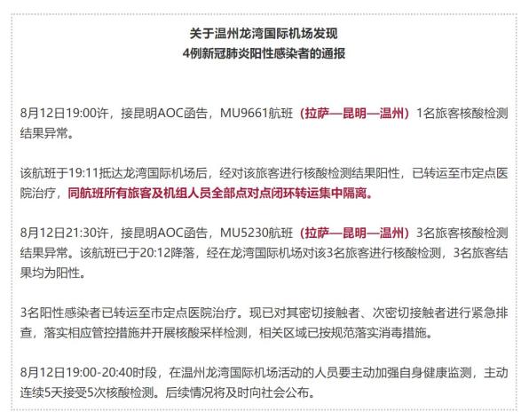 8月13日,浙江温州发布通报称龙湾国际机场发现4例阳性,涉及MU9661、MU5230两个航班。MU9661航班所有旅客及机组人员已全部集中隔离。
