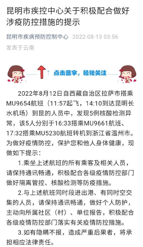 8月13日,云南昆明疾控提示,自西藏拉萨搭乘MU9654航班到昆人员中,5例核酸异常,该5人曾分别搭乘MU9661、MU5230航班:
