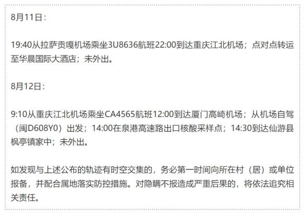 8月13日,福建莆田仙游县通报:12日23时10分,接到异地方面协查通报,省外一例经落地机场返莆人员初筛阳性,经复采复核为阳性。涉及3U8636、CA4565两个航班: