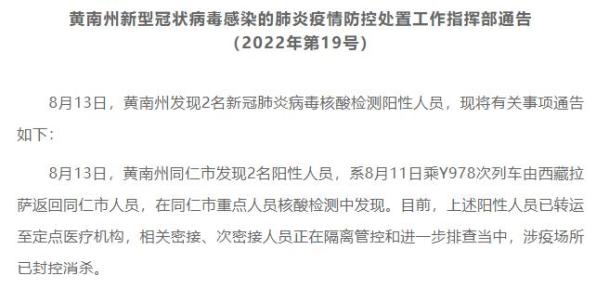 8月13日,青海黄南州发现2名新冠肺炎病毒核酸检测阳性人员,系8月11日乘Y978次列车由西藏拉萨返回同仁市人员。