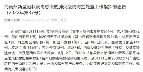 8月12日,青海海南州发现1名新冠核酸阳性人员,系8月11日乘Z6802次列车由拉萨经西宁返回共和县人员。