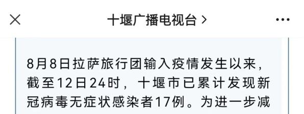 截至12日24时,十堰市拉萨旅行团输入疫情已累计发现无症状感染者17例。