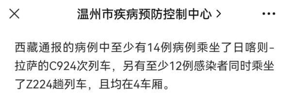 据温州疾控梳理,西藏通报的病例中至少有14例病例乘坐了日喀则-拉萨的C924次列车,另有至少12例感染者同时乘坐了Z224趟列车,且均在4车厢。